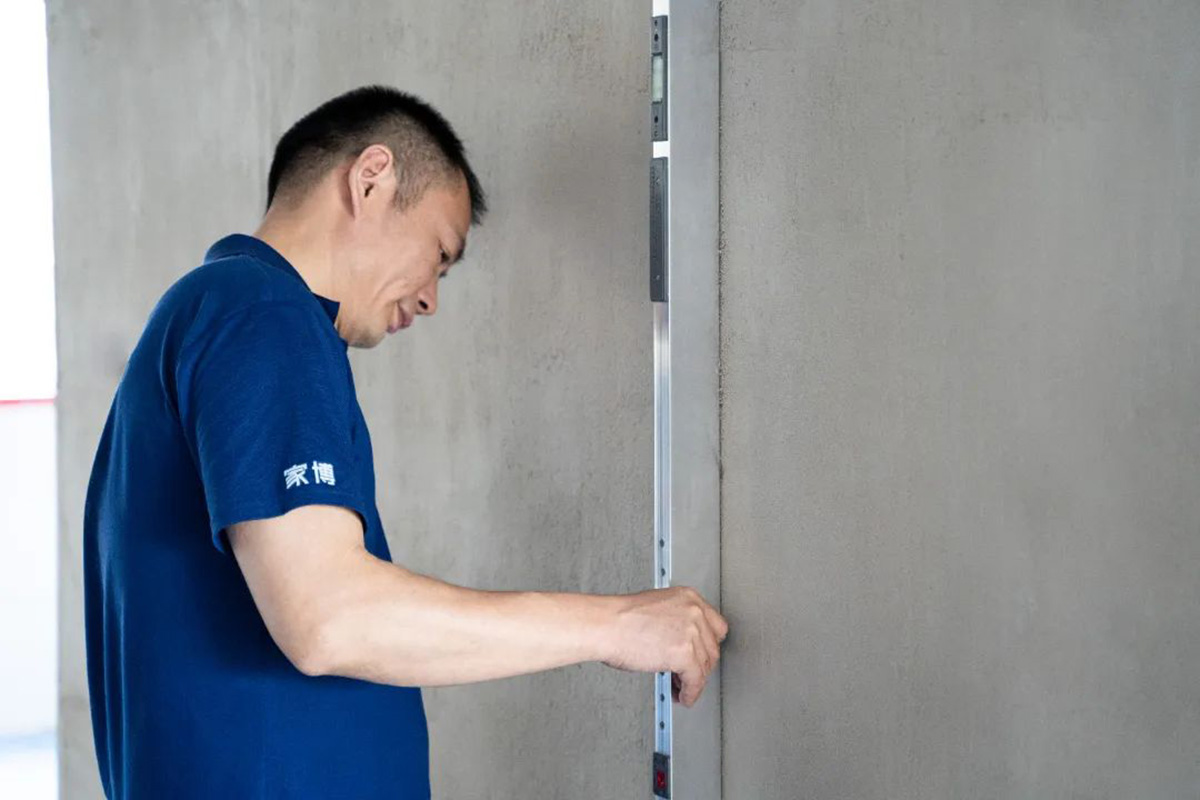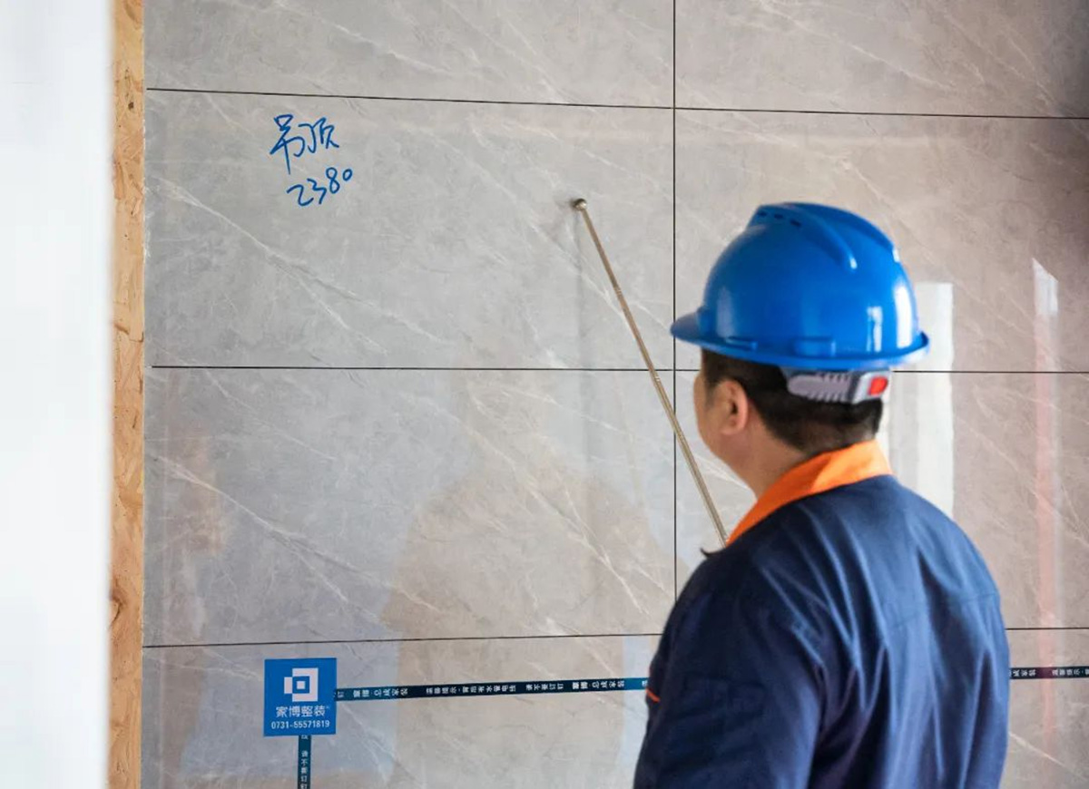 ▲質檢組使用2米水平靠尺檢測墻面平整度。墻面的平整度是影響整體視覺效果最重要的因素之一,因此每一次巡檢,墻面檢查都是重中之重。