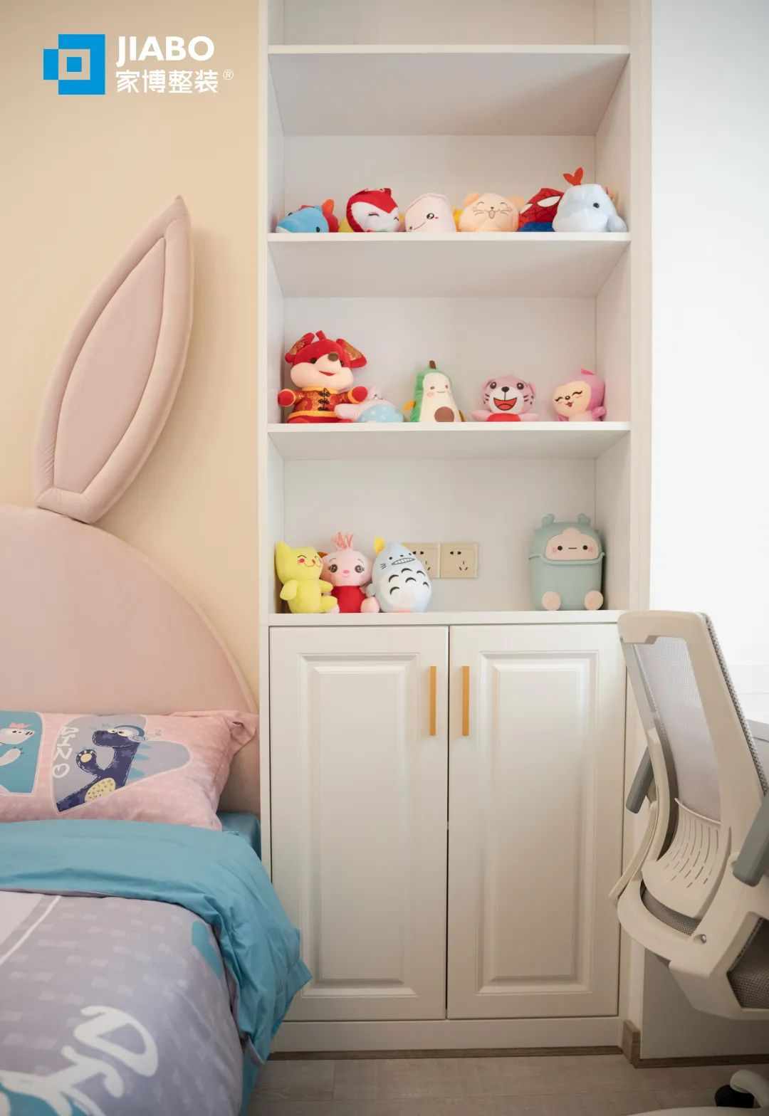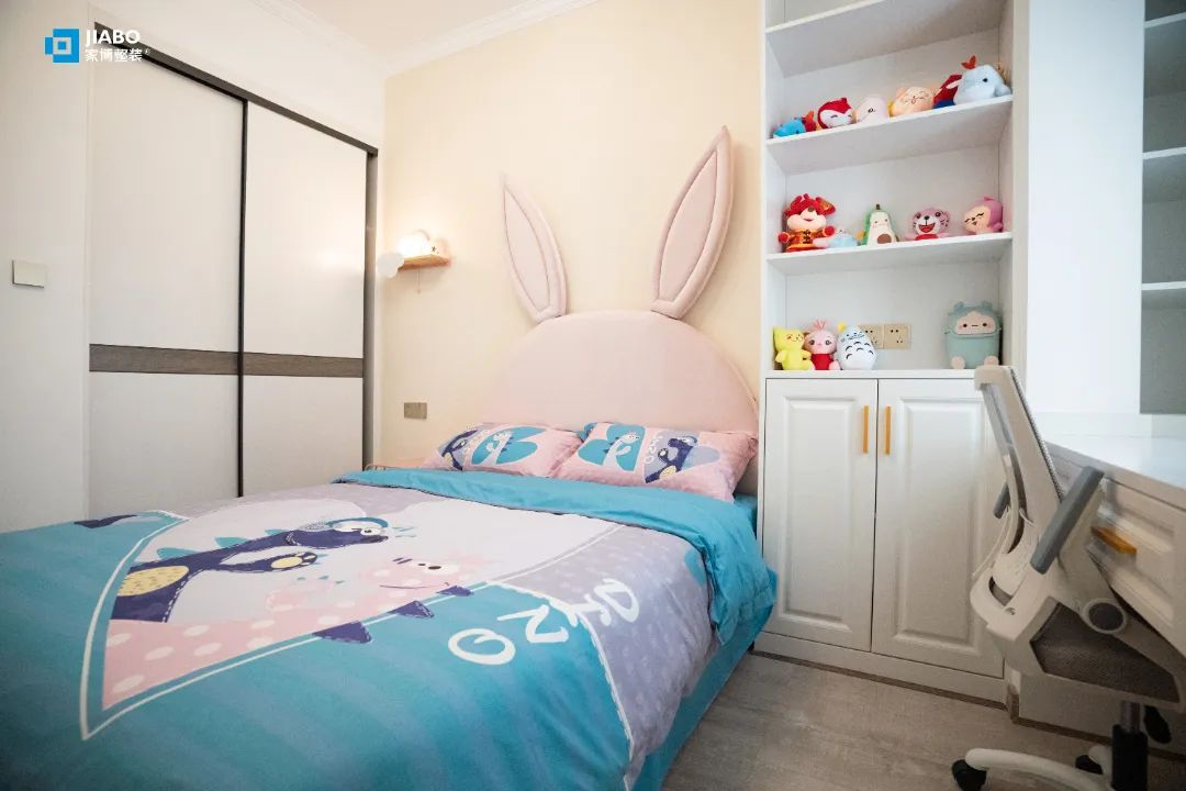大大的兔耳床,讓每一個美夢都童真又童趣。床頭的星月燈躲在云朵上,家也是孩子永遠的避風港。